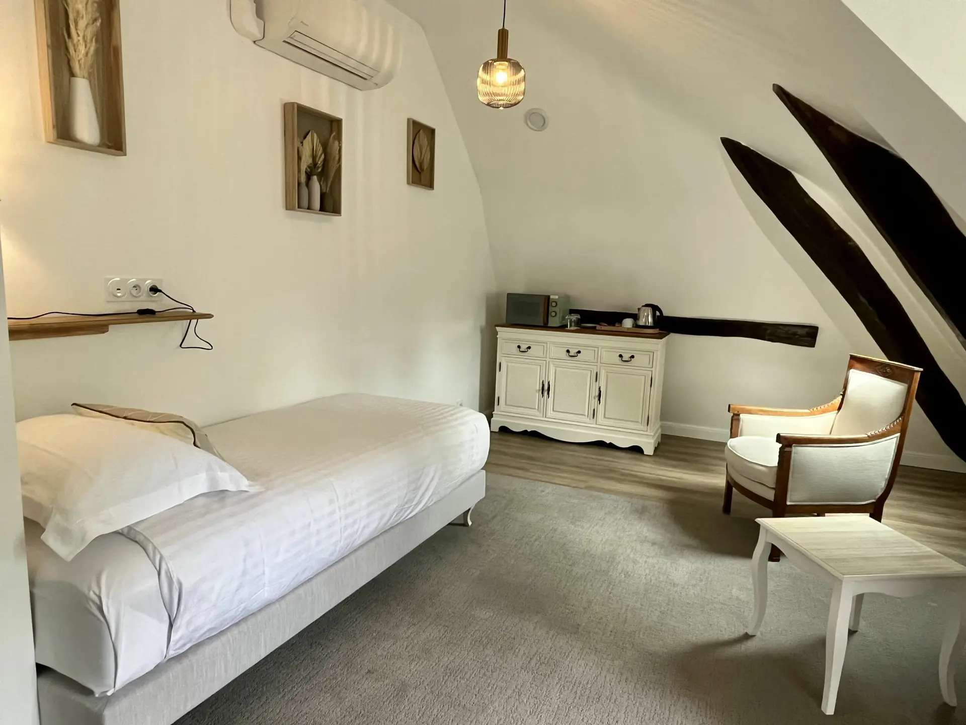 Située au 2ème étage du manoir, vous découvrirez le charme et la douceur de cette suite traversante de 45m2 avec une vue directe sur le Loire et sur le parc composée de 2 pièces.