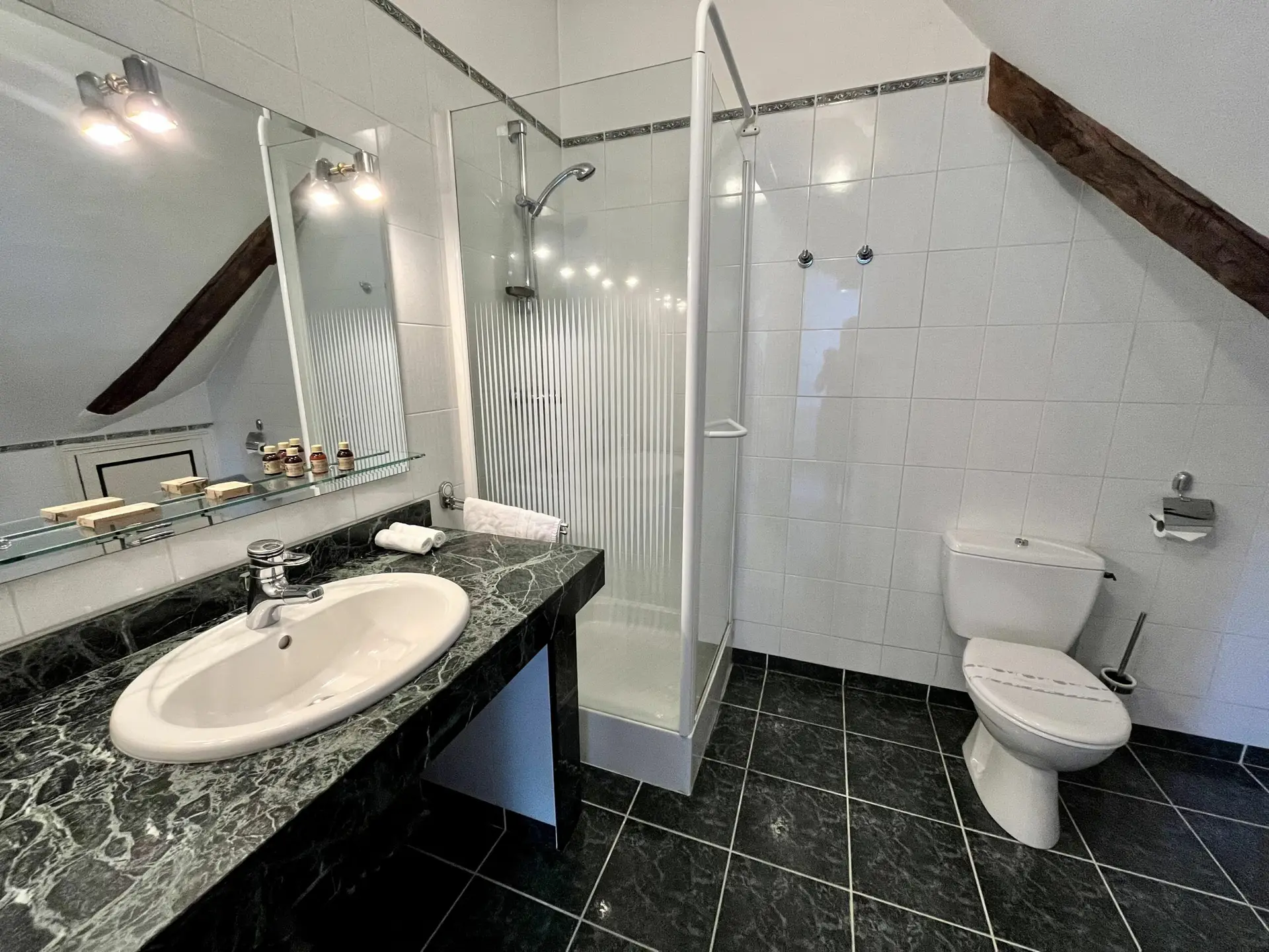 Située au 2ème étage du manoir, la charpente avec poutres apparentes en double parapluie vous transportera dans un cocon d’authenticité.